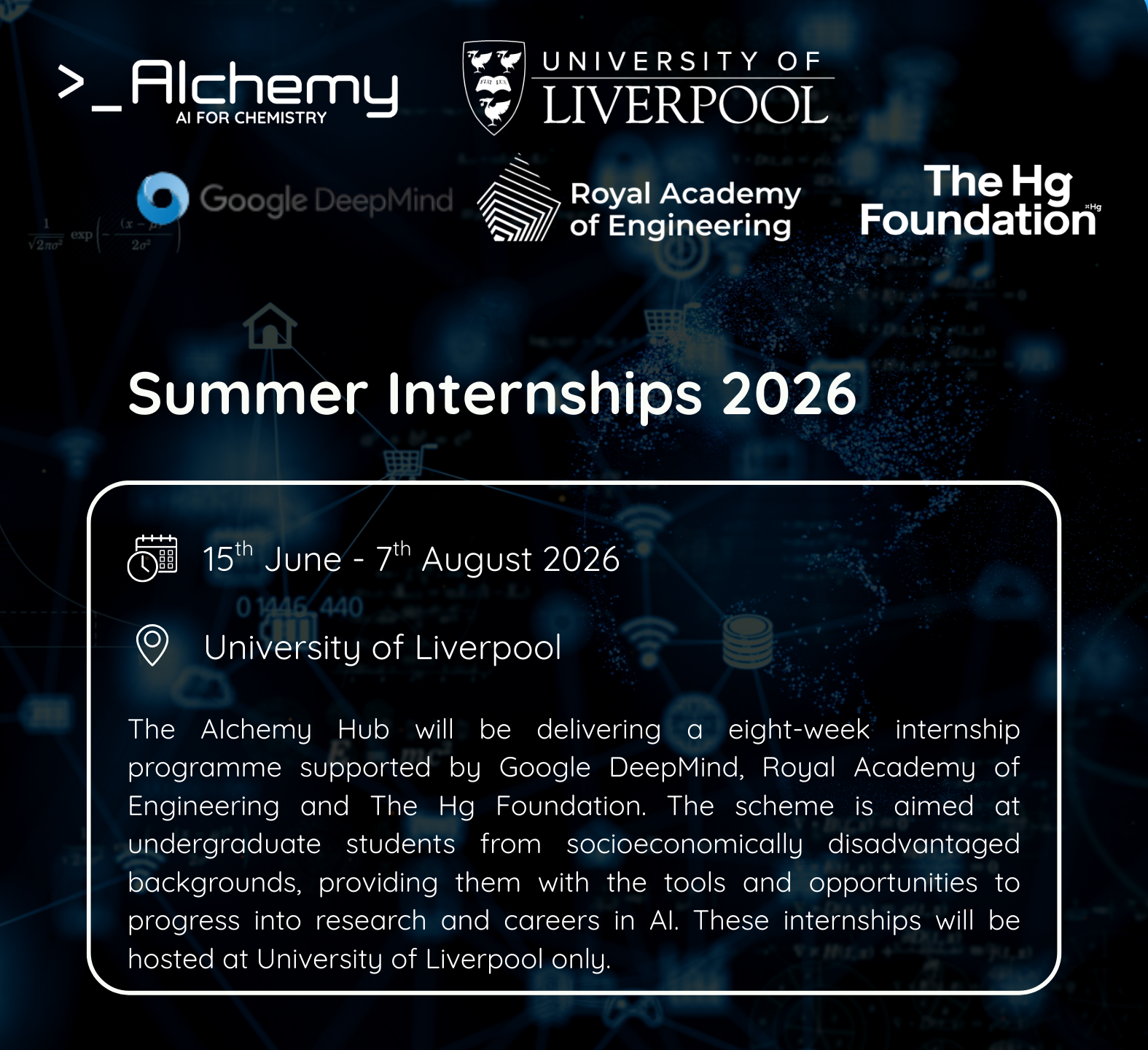AIchemy is a UK hub with an interdisciplinary leadership team from Imperial College London, University of Liverpool, University of Cambridge and University of Southampton.