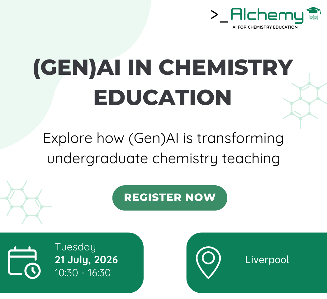 This UK national workshop brings together chemistry educators, students, and policy leads to accelerate the integration of Generative AI (GenAI) methods in chemistry education. Building on last year’s event, the focus moves decisively beyond abstract debate toward classroom-ready practice, shared resources, and cross-institutional learning.