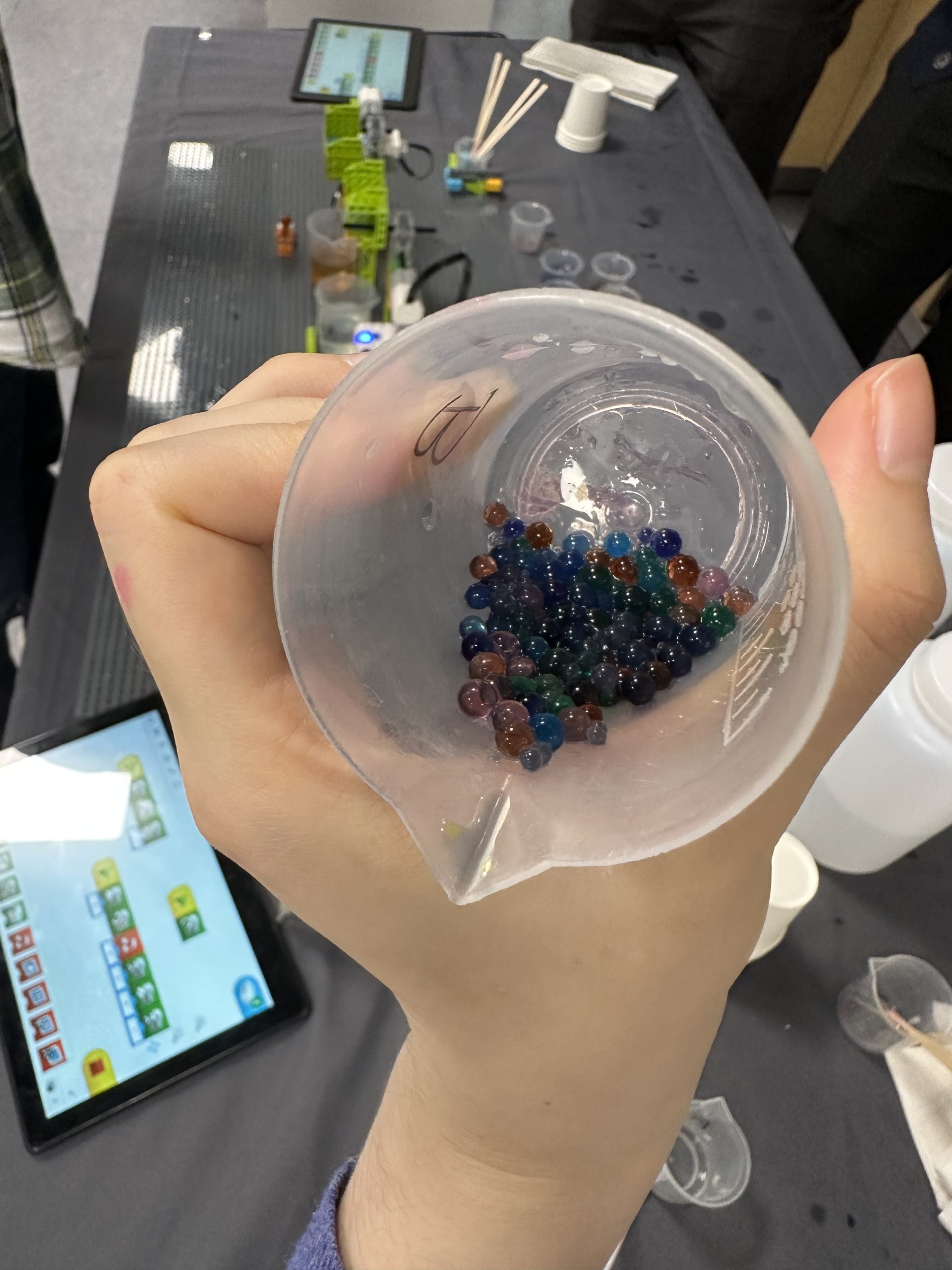 Dr Xue Fang explained “we guided the children to modify the morphology and degree of polymerisation of the slime by varying the starting position and pouring speed: dropwise addition of sodium alginate into calcium chloride solution produced well-defined spherical slime beads, whereas rapid, continuous pouring generated long strands (see photos below). Colouring dyes were introduced to enhance the engagement. By tuning the rotating speed and timing of the robot, the children experienced a simplified form of parameter optimisation used in real-world automated chemistry workflows.”