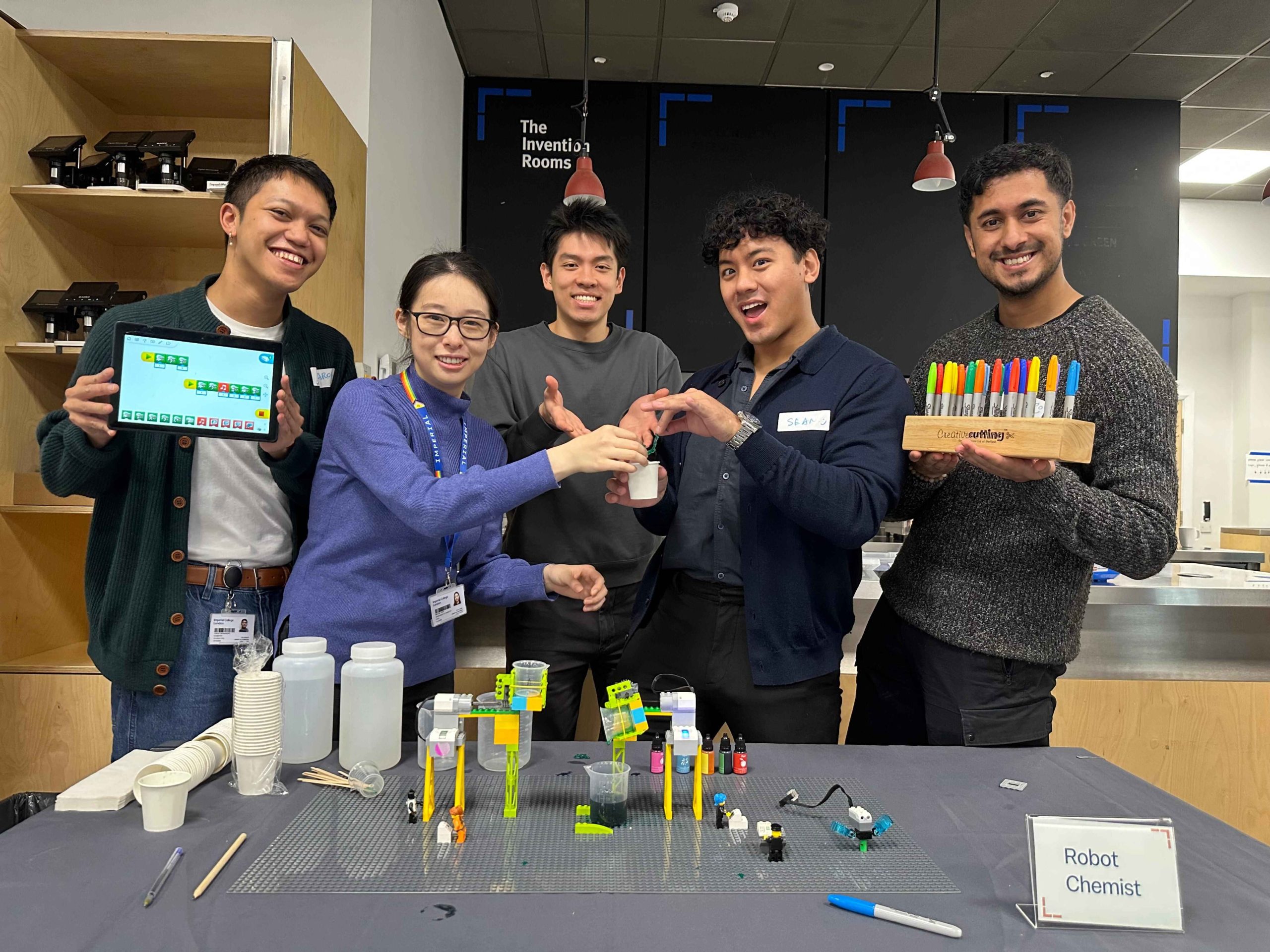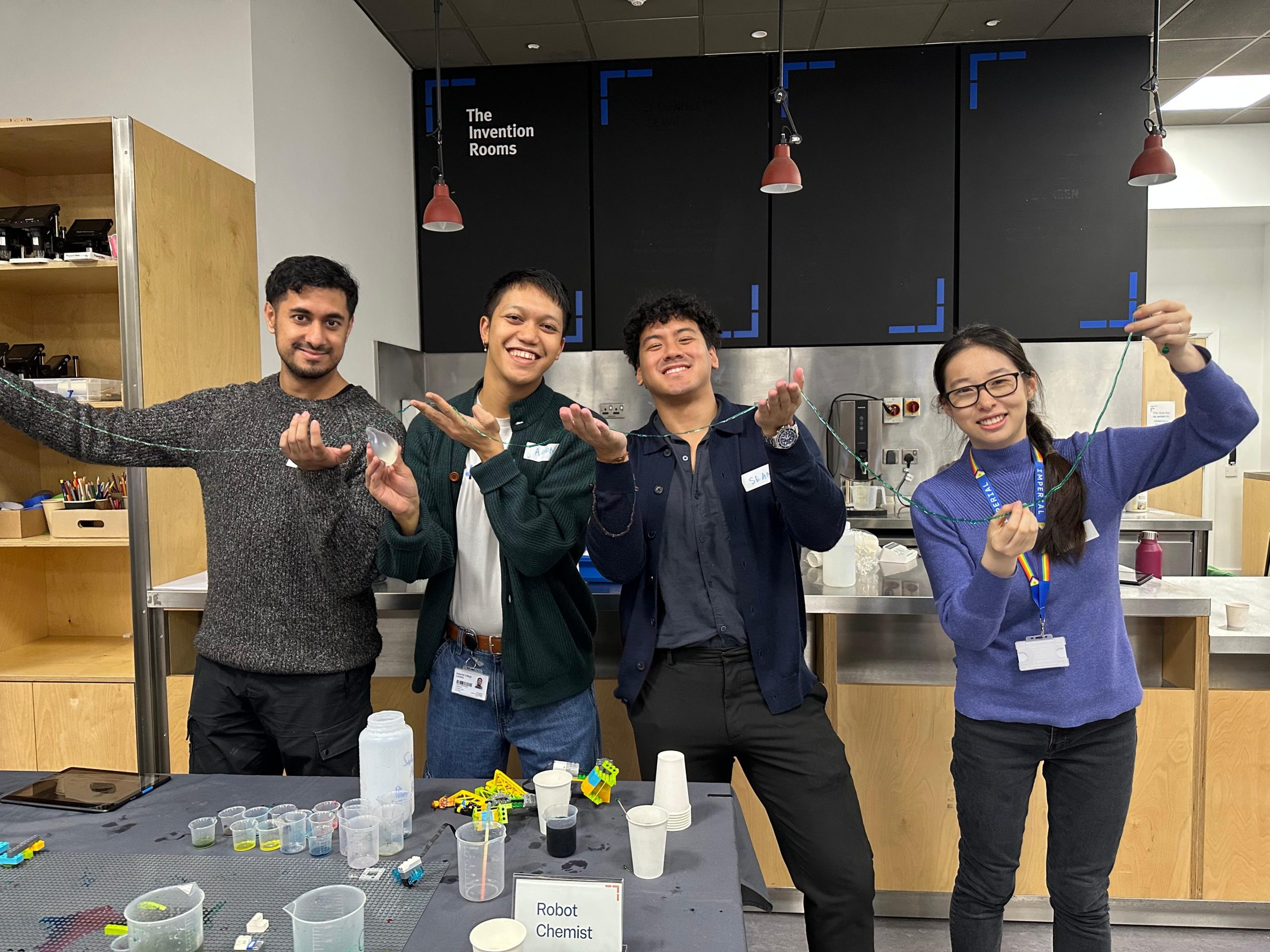 AIchemy researchers Dr Xue Fang, Sean Gurung, and Miguel Ye, along with colleagues Aaron Hero Bernardino and Manahill Rabbani, based in the Greenaway lab, and the public engagement team (Andrew Brooks) at Imperial, delivered a “chemistry robot” interactive exhibition for the 2025 Imperial Discovery Day at The Invention Rooms to introduce the concepts of AI and automation, and their applications in chemistry. The project guided children aged 7 to 11 to program a LEGO robot using the WeDo graphic programming interface to synthesise slime by mixing sodium alginate and calcium chloride solutions.