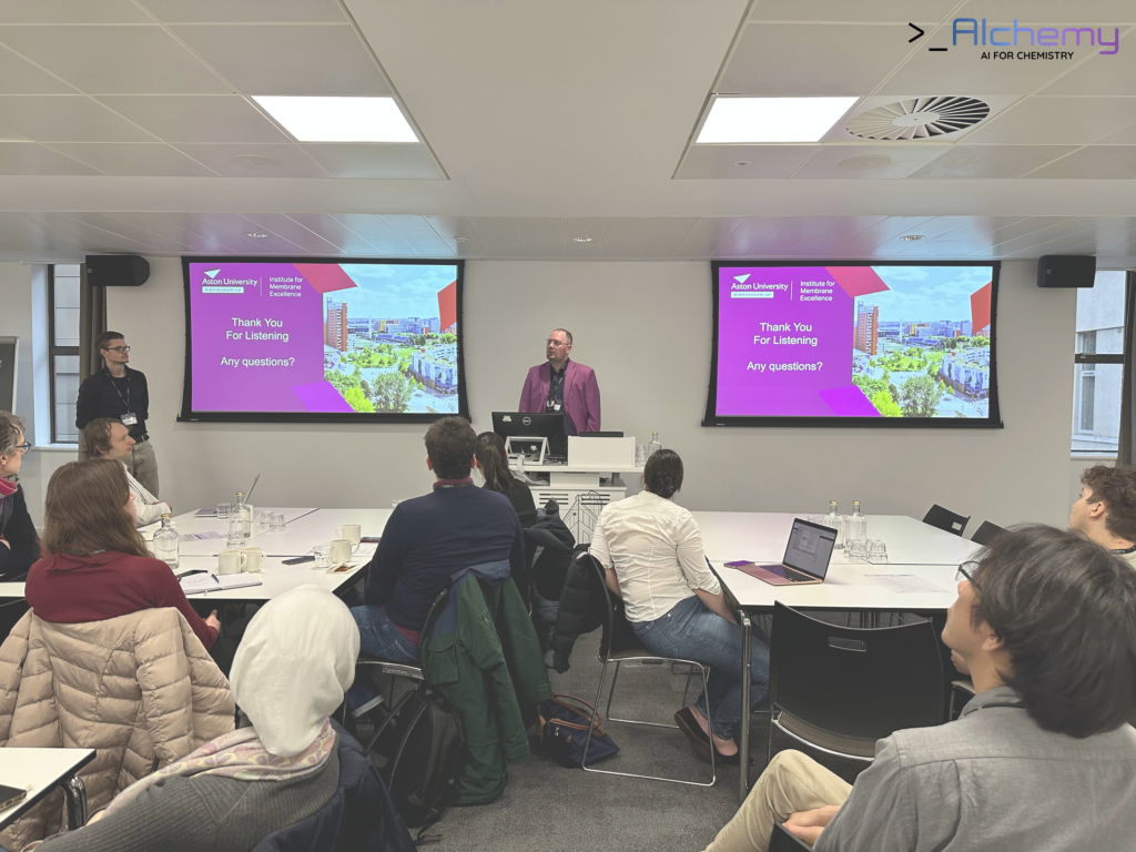 The afternoon programme showcased the breadth of AI applications across chemistry. Dr Eleonora Ricci (University of Edinburgh) presented a transfer learning approach for predicting polymer equation-of-state parameters, demonstrating how data-efficient models can be leveraged in materials science.