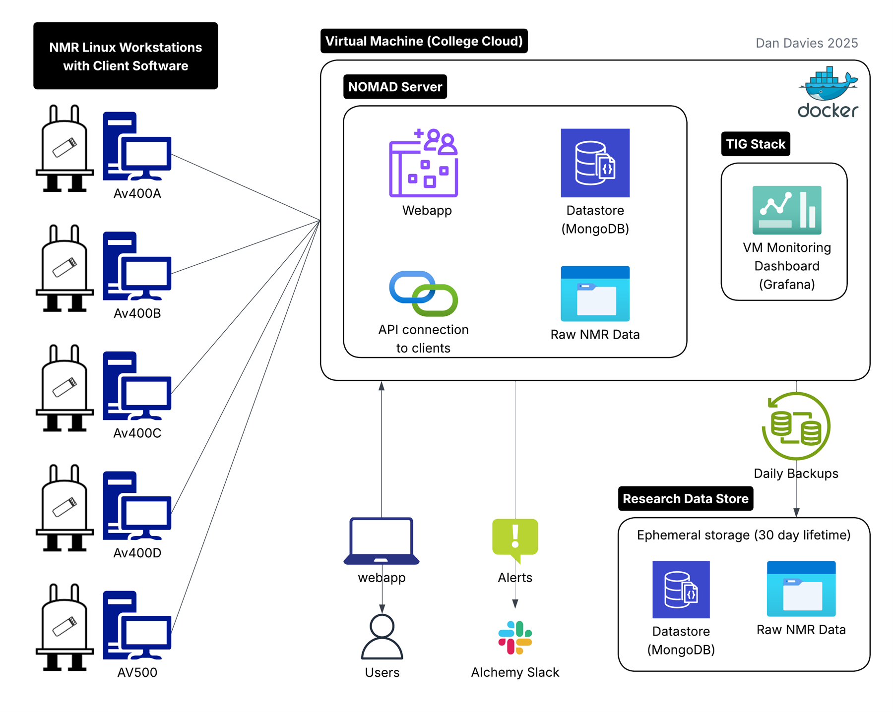 The diagram below shows how all these components fit together — from NMR spectrometers to the NOMAD database, backups, and monitoring.